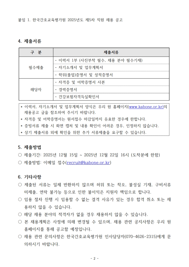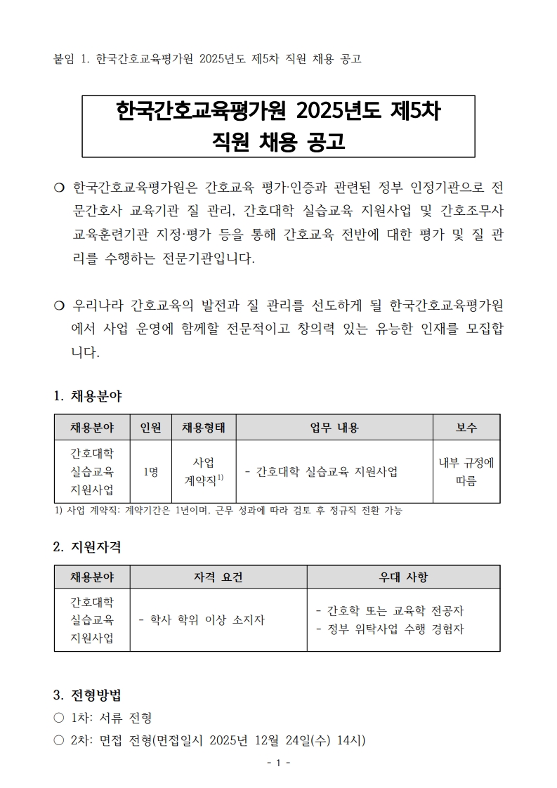 붙임 1. 한국간호교육평가원 2025년도 제5차 직원 채용 공고.pdf
